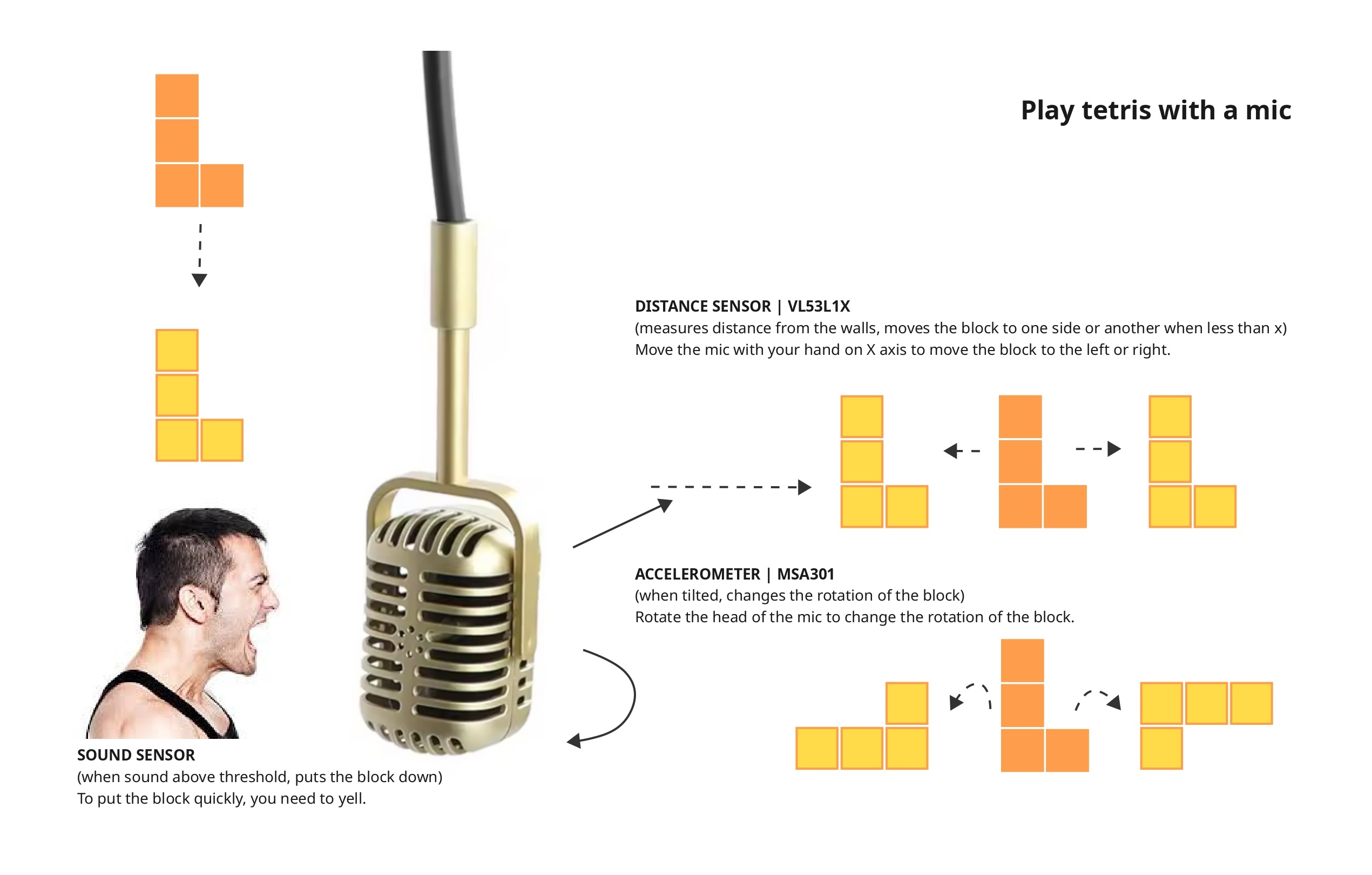 To move left and right, you need to move the mic in the air on the x axis. The distance sensor in the mic measures the distance from the walls - when less than certain number, moves the block one step.