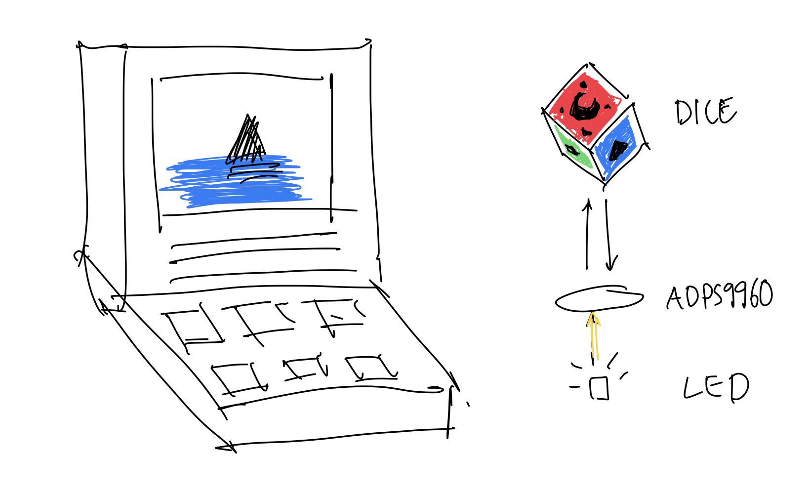 I also have an interest in making real-time visualizations to music, so the box could be used for that too later on, with the dice changing parameters. Removing one dice could allow for some realtime control via the distance sensor on the ADPS sensor.