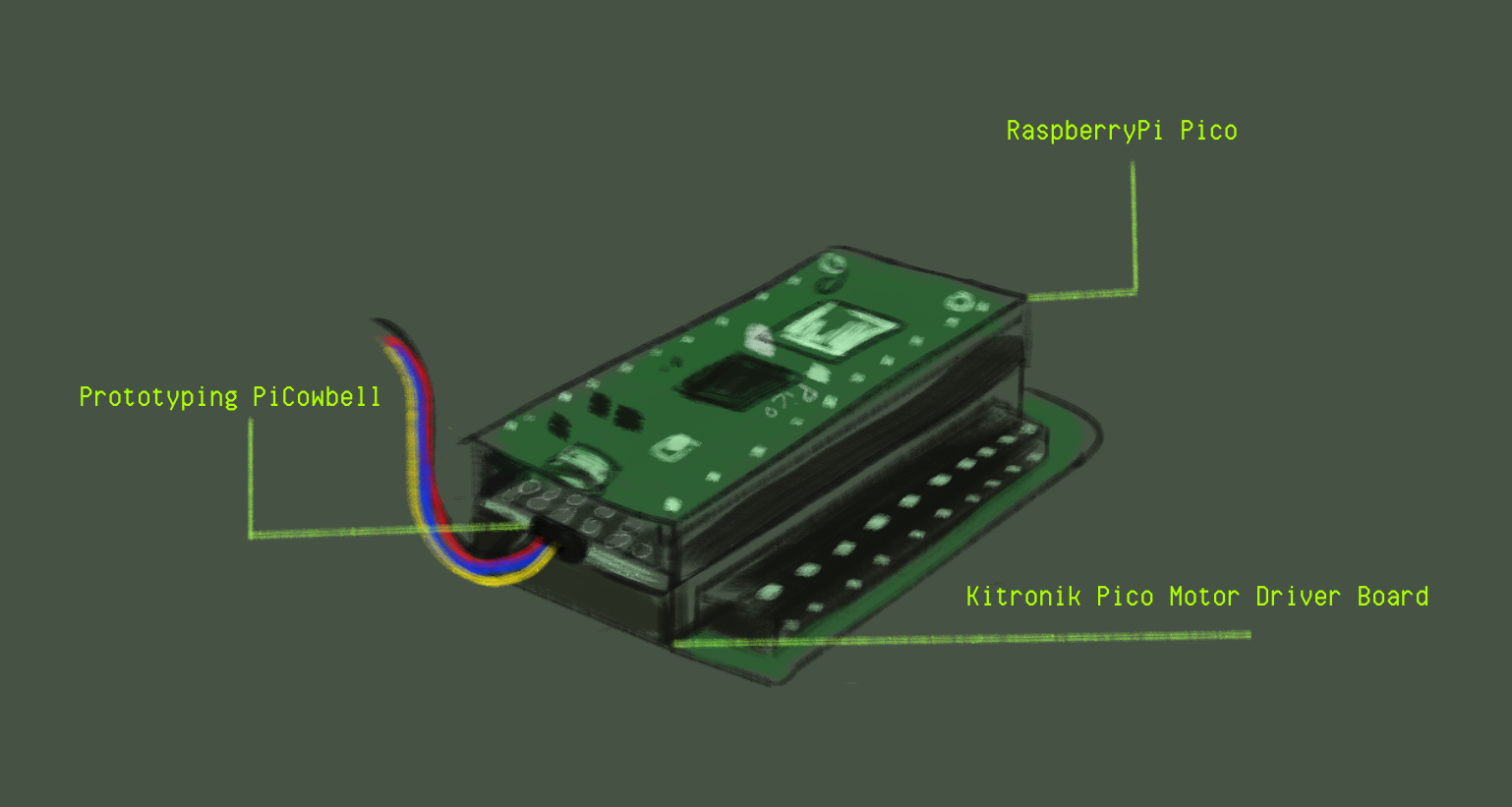 The RaspberryPi’s were attached to a Prototyping PiCowbell part. Prototyping PiCowbell is the part that can read the specific type of cable for the sensors used for the rainsticks. This part was attached to the Kitronik Pico Motor Driver Board part. This board receives the needed power voltage to use the motors. This part is connected to the motors directly.