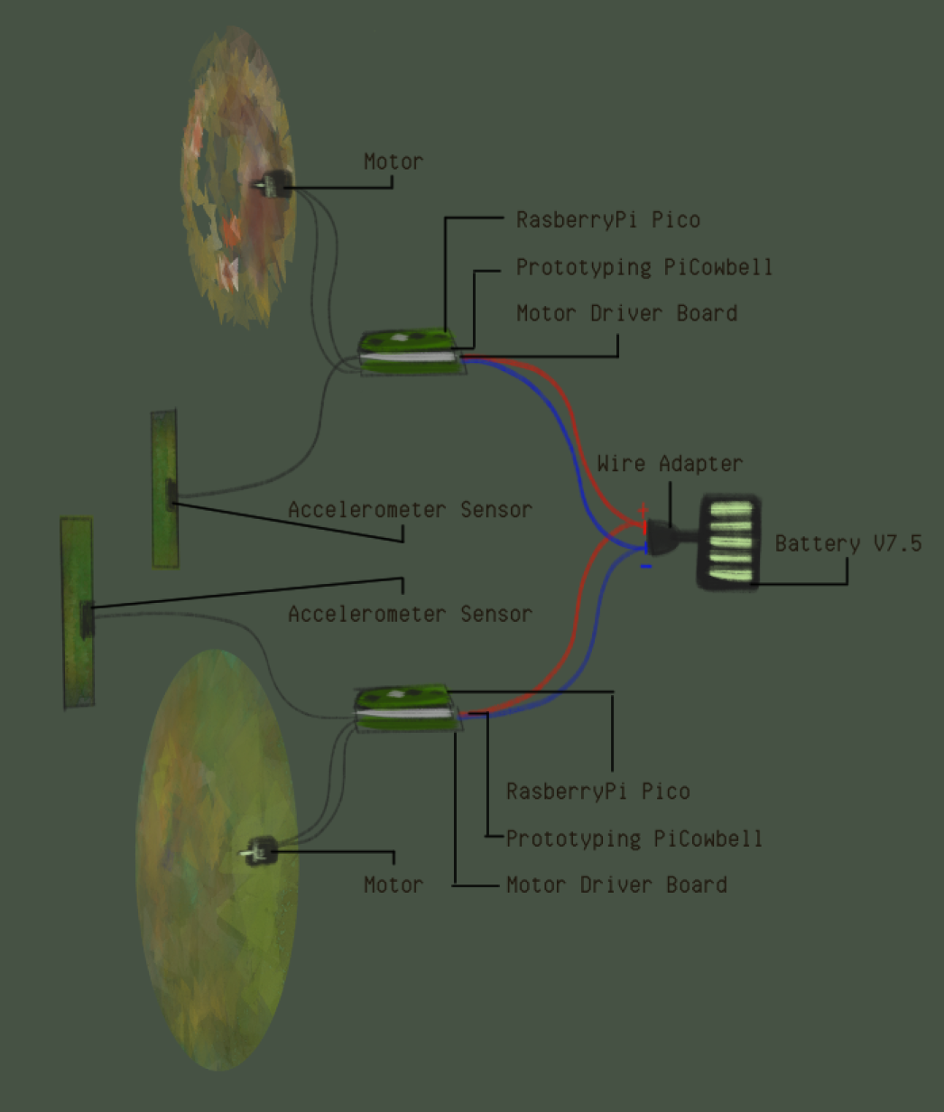(7.5V) Power source has a part that distributes energy ( + & - ). To each Motor Driver board, a + and - wire is attached to give the RaspberryPi and the accelerometer power. The Motor is connected to the Motor Driver board directly. The Prototyping PiCowbell has an accelerometer attached which give out tilting data. The RaspberryPi controls the logic of the received accelerometer data and powers the motor speed according to the logic.