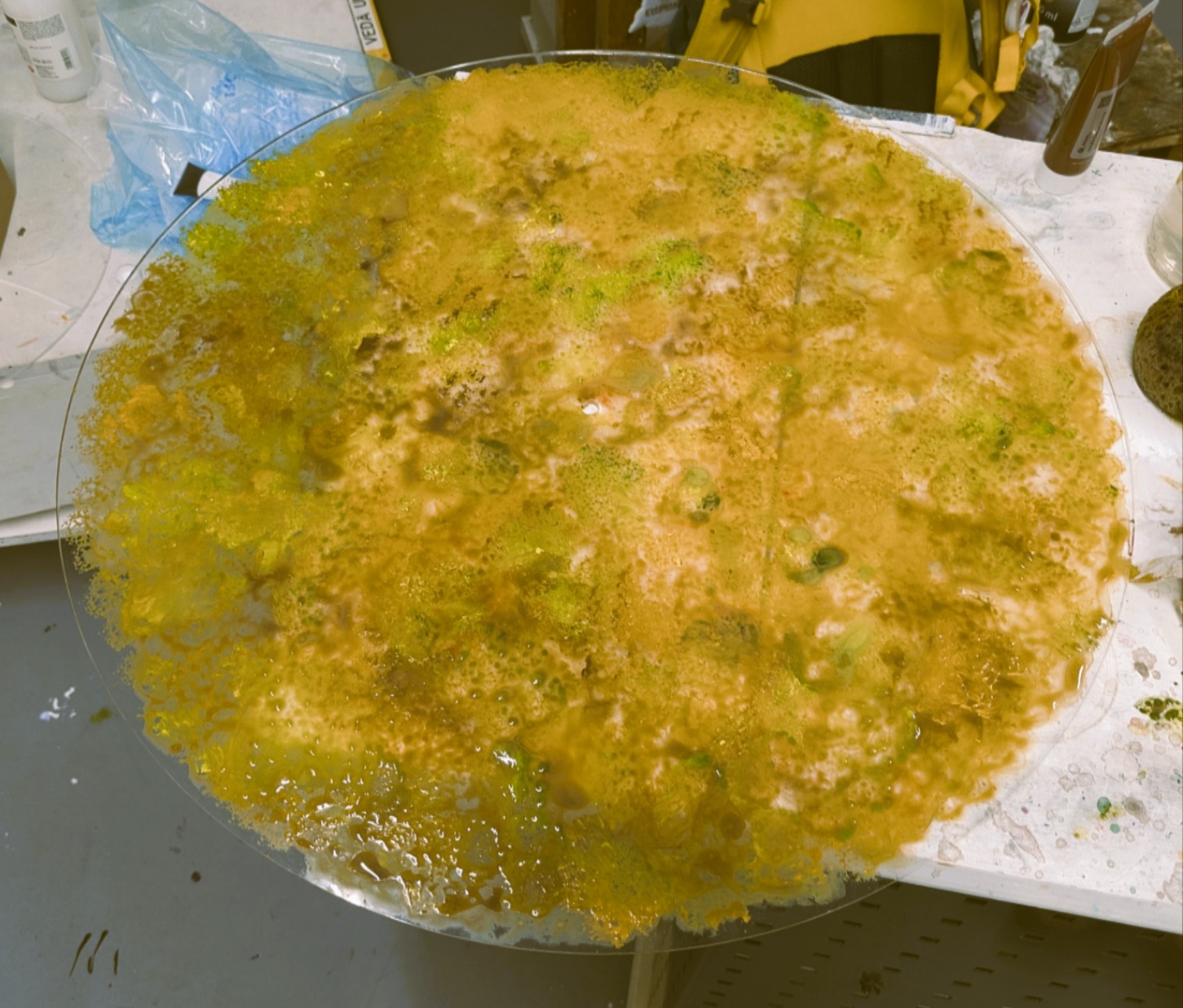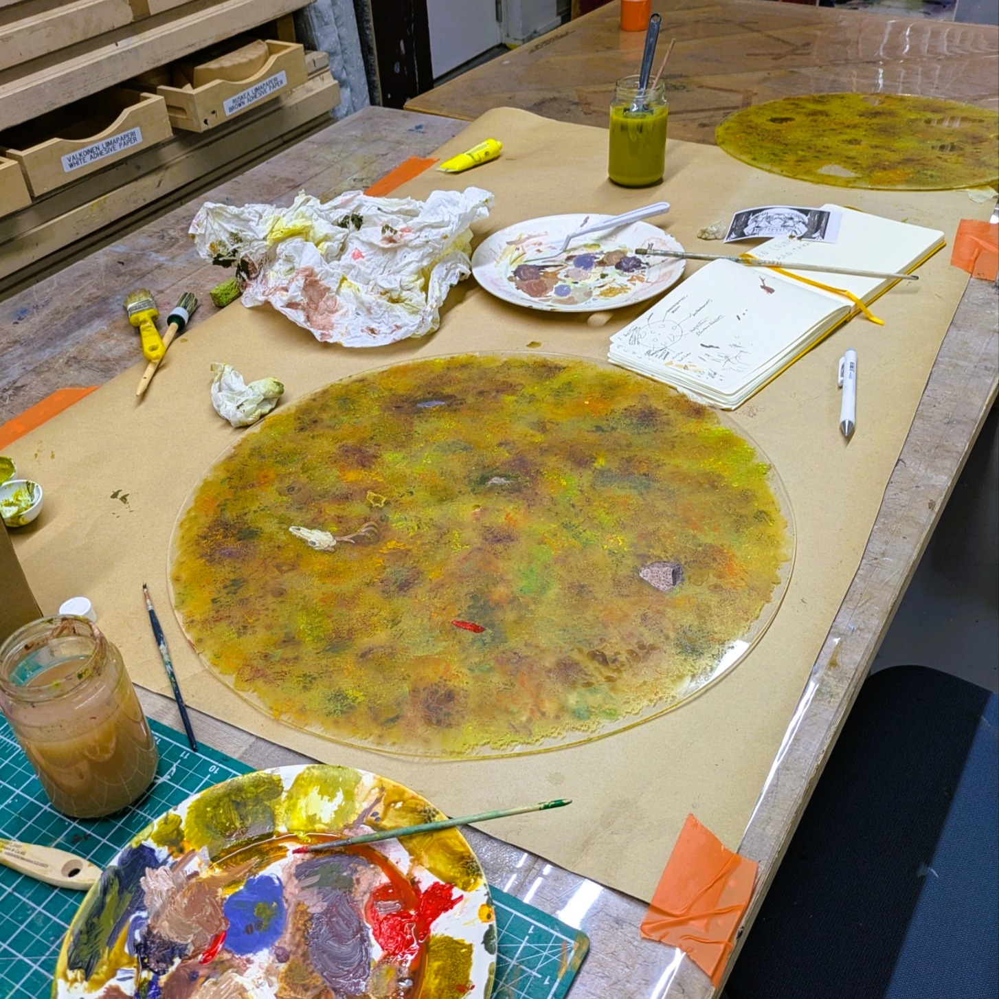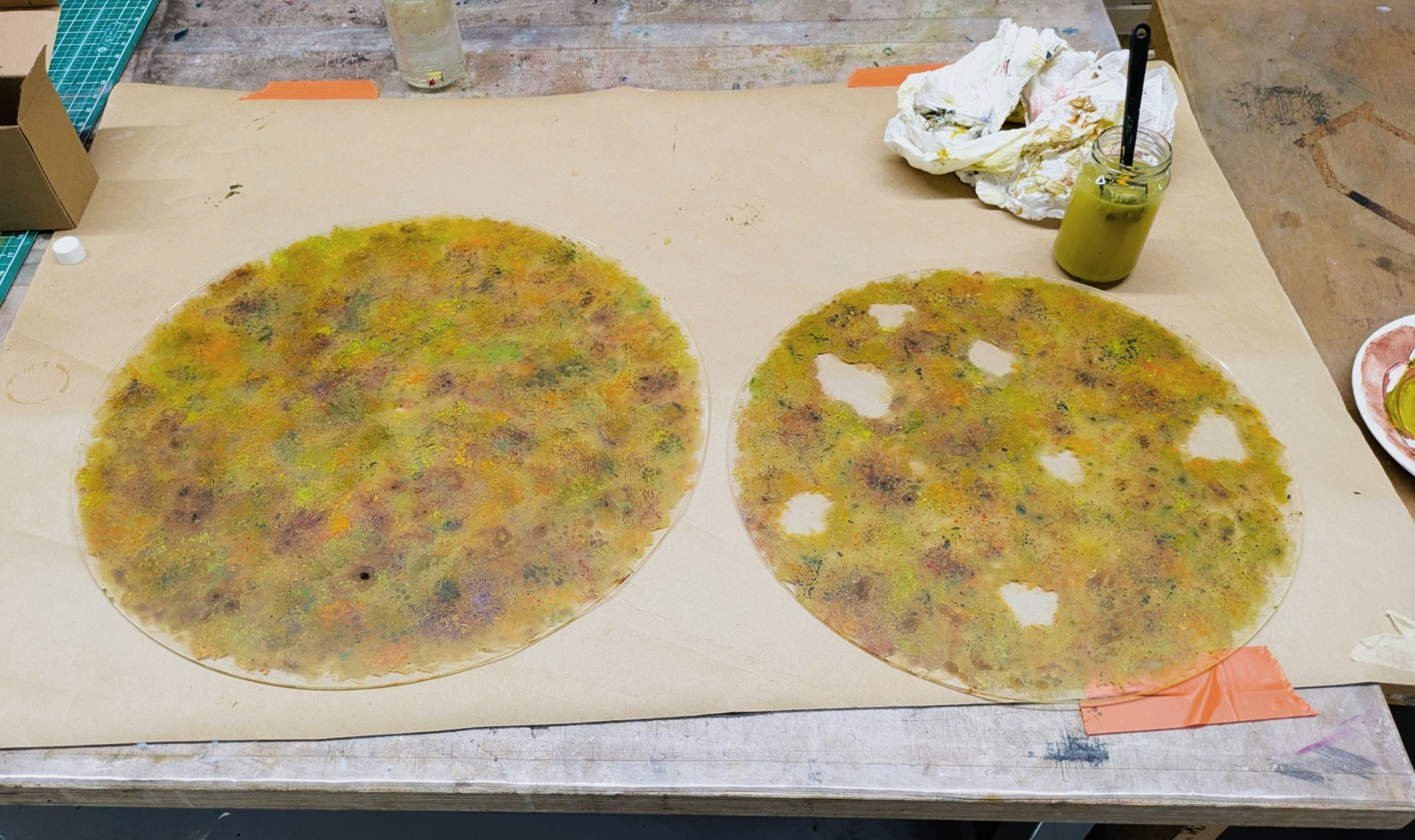 I booked an atelier space to work with the acrylic sheets for some days. I had the impression that it was beneficial to coat the acrylic sheet with something like a pouring medium to make the acrylic paint stick better to the canvases. I tested the pouring medium on the transparent sheet, but noticed that it left a bit of a residue. I decided not to use it due to this. However, acrylic paint stuck to the acrylic sheets without an issue without any prework, so it was possible to proceed with the painting.