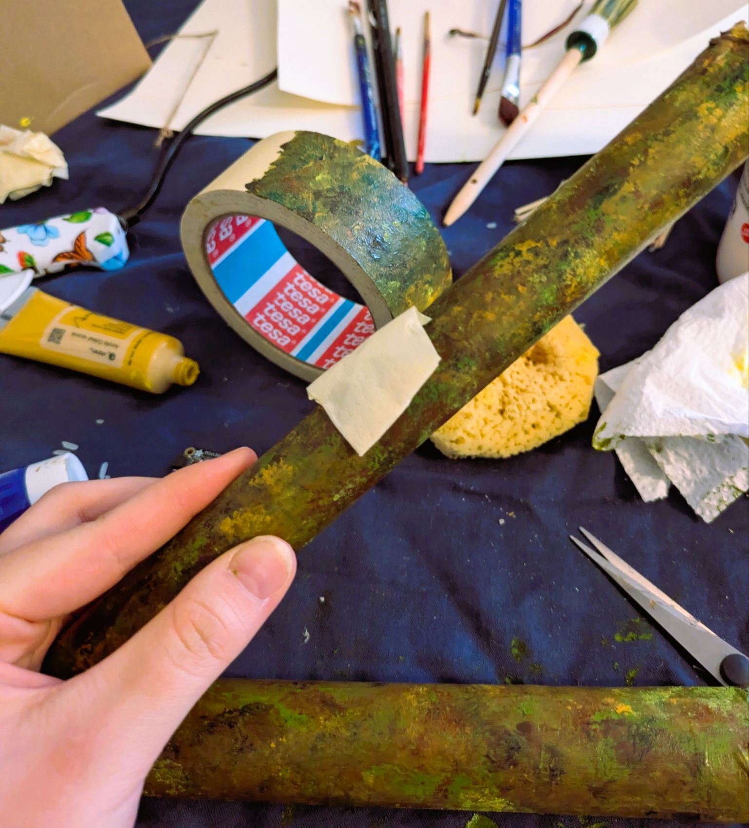 Since the sensor couldn’t fit inside the rainstick with the additional wooden pieces, the sensor needed a pocket to fit outside of the stick. A pouch was made outside the stick with tape and then painted.