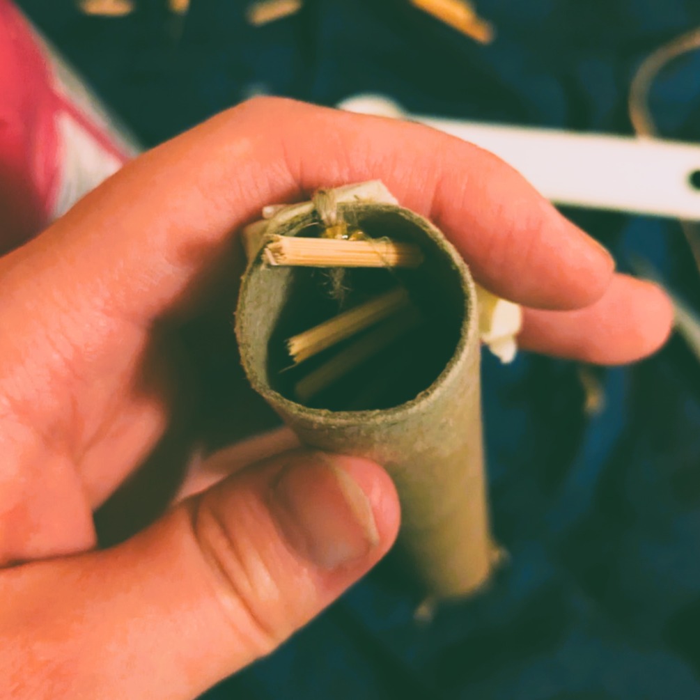 The rainsticks were made of two different sized cardboard cylinders. To create a more rainlike sound with the cylinder, an additional filling piece was added inside the cylinder. These were created with grillsticks and a piece of jute rope. The grill stick parts were hot glued to the jute rope and then pulled inside the cylinder, before adding the rainstick filling.