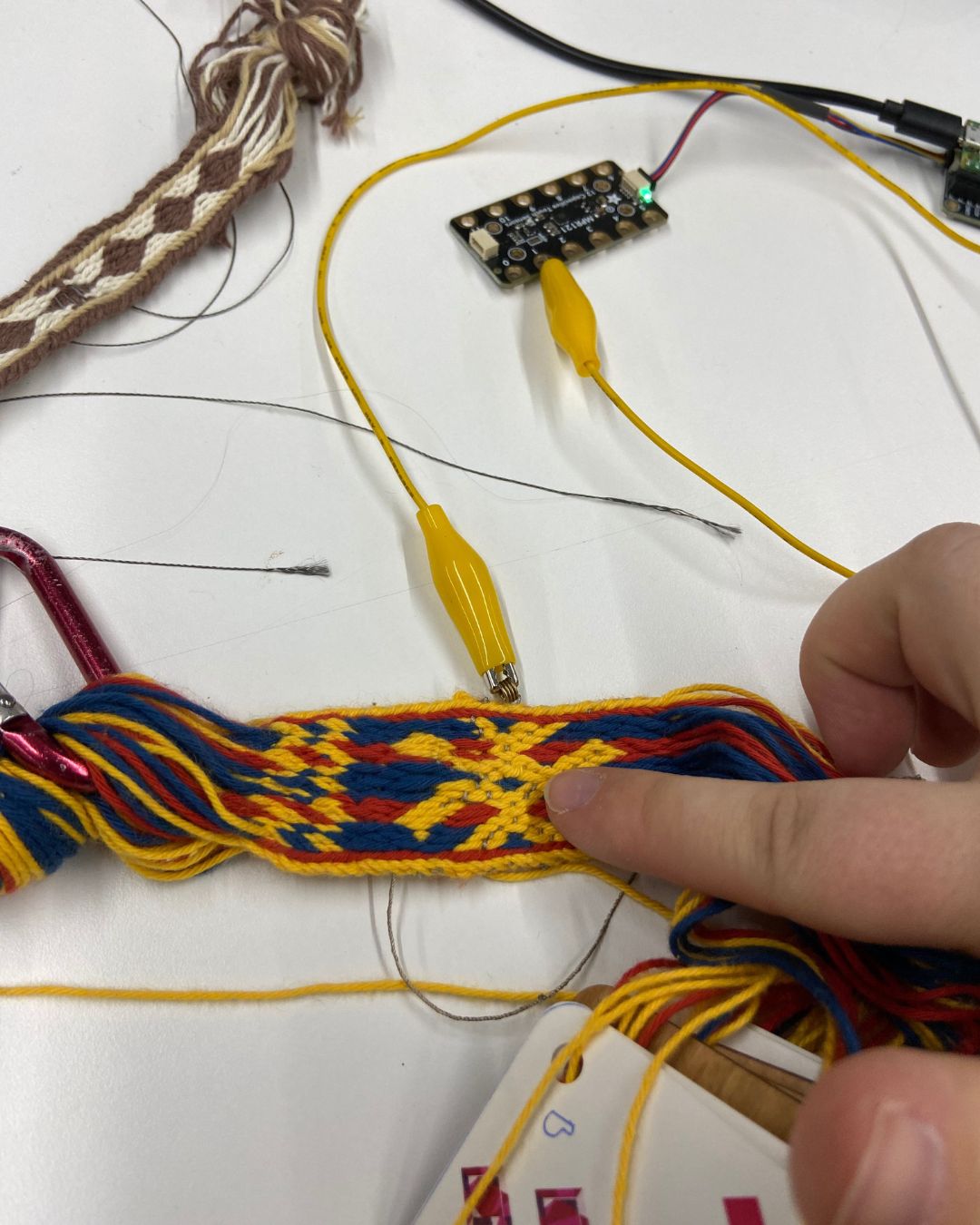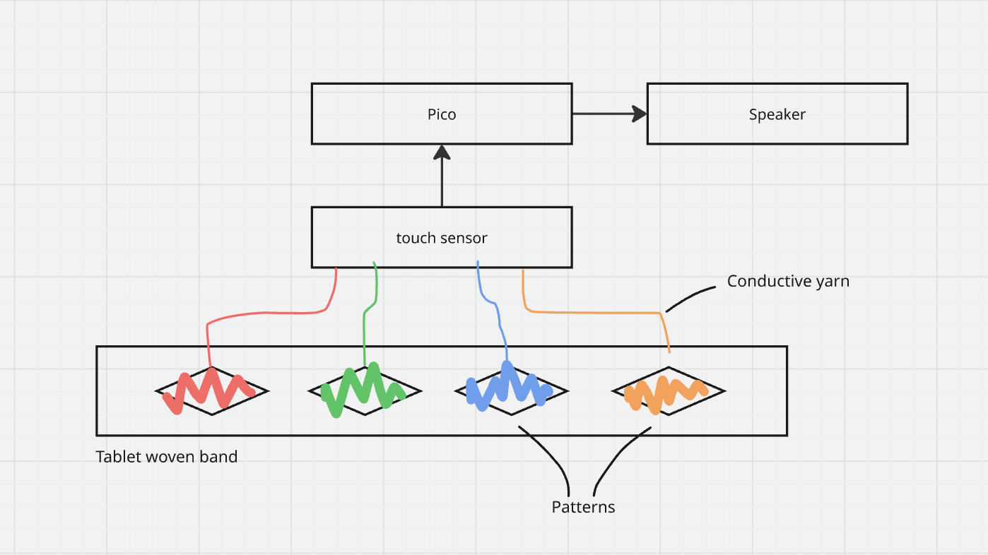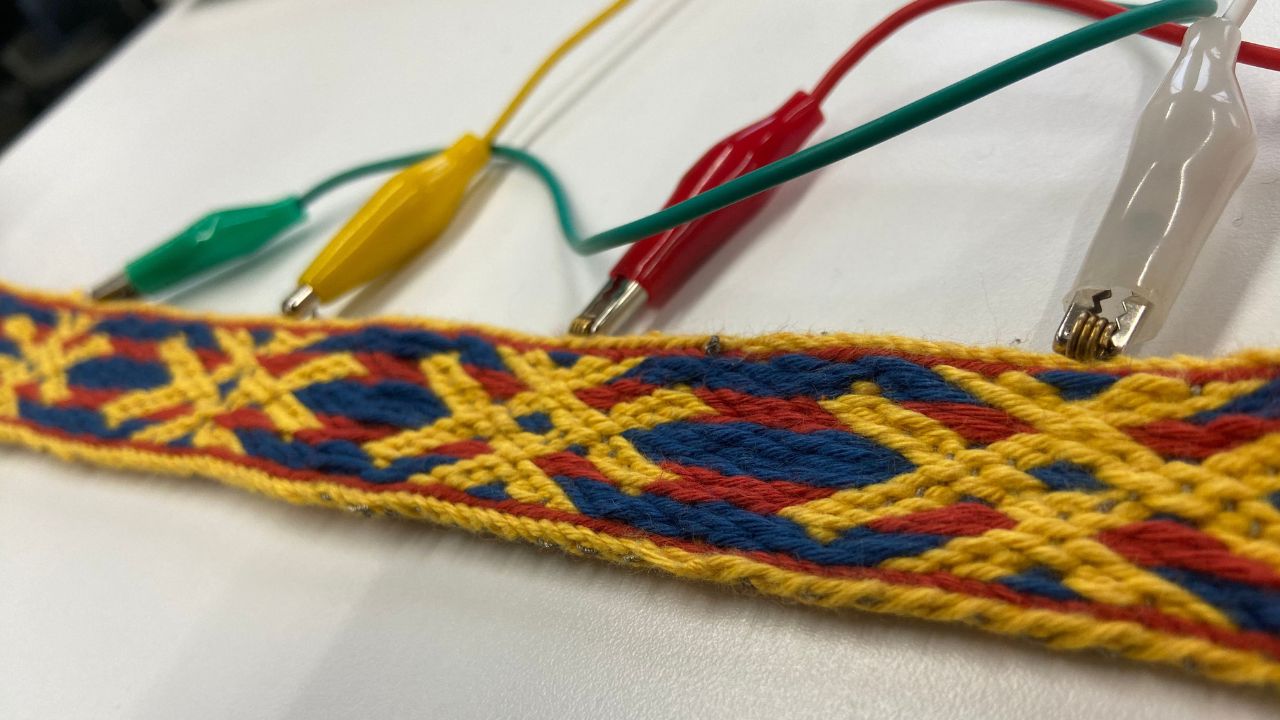 The end result is a tablet woven band that works as a simple interface. Each pattern section is woven with conductive yarn, and works as a touch area. Touching each area plays a different sound.
