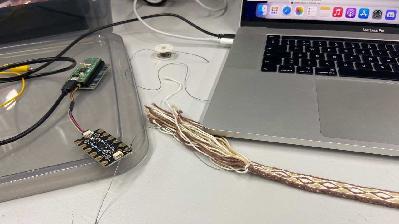 This time I did not get any input from the touch sensor, unless I directly touched the tails of the conductive yarn. I suspect it was because the weft is woven quite tightly in the band and I didn’t touch it directly, although it did work with with the first prototype. Not really sure why that one worked and this one didn’t.