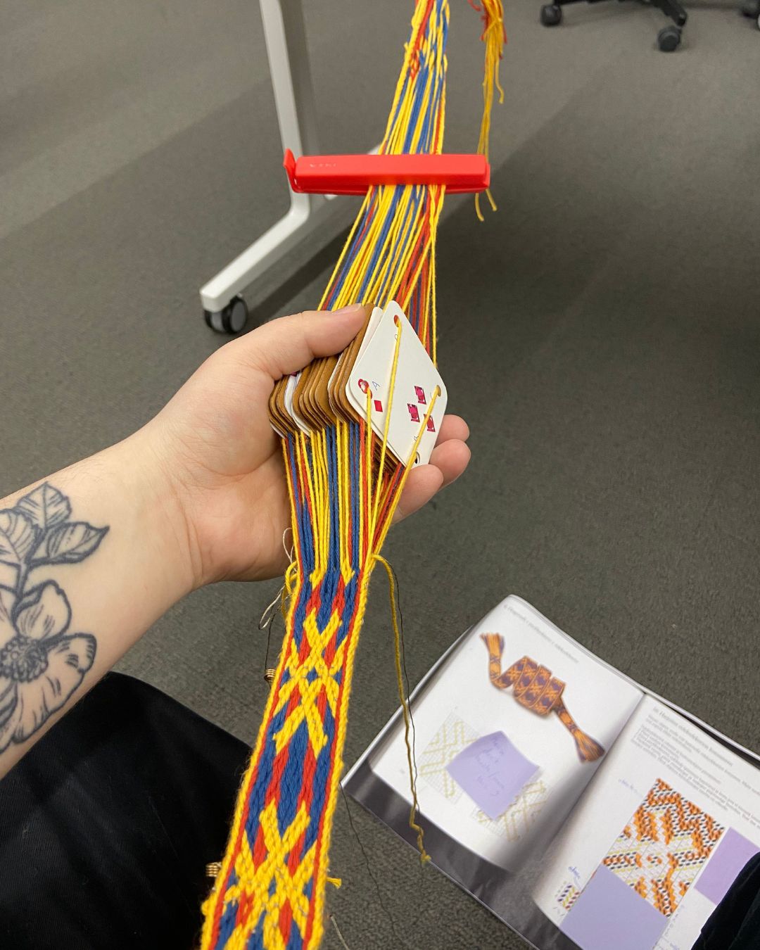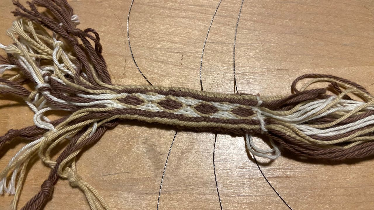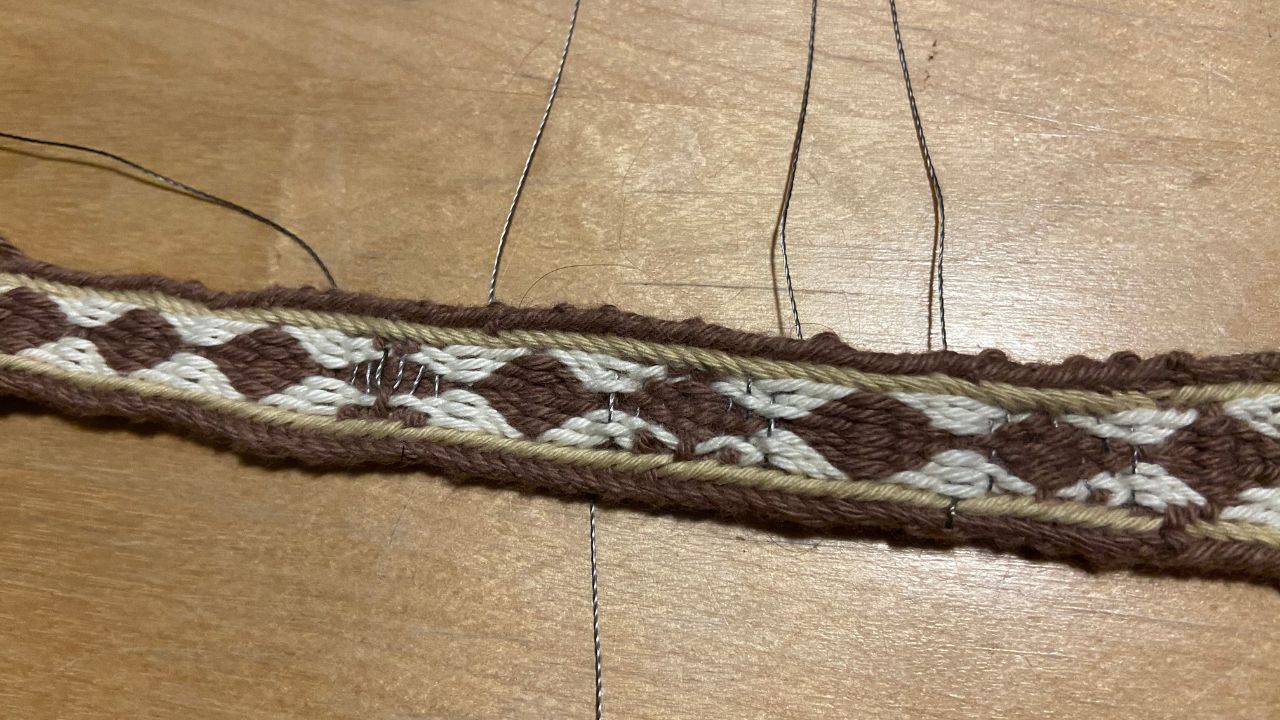 This was a risk worth taking: after weaving the first pattern section I tested it and the touch area worked beautifully. After initially fumbling with reading the rapport, the weave started to actually look nice. I’m happy I got the results I wanted with using an actual period-appropriate method — although it was very labor-heavy. Each section took about 2 hours to weave, and I got 4 sections done by the critique.