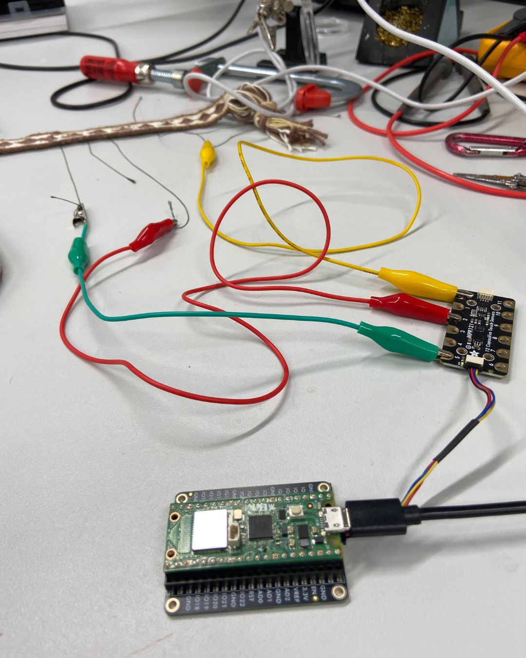 The touch areas are connected to a capacitive touch sensor with alligator clips, and the touch sensor is connected to Pico, which turns the touch input to a keyboard press. Pressing different keys triggers the sounds on Touchdesigner that is open on my laptop.