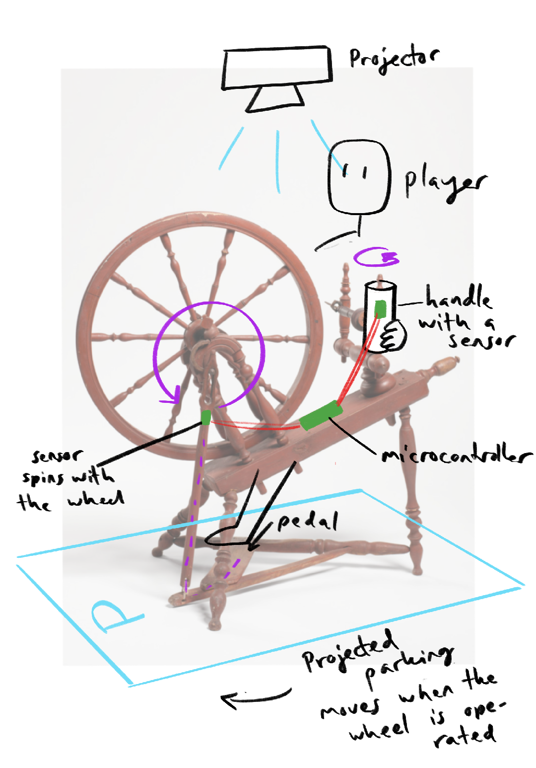 The left-right controls: The spinning wheel has many parts that could work for left-right controls. I wanted to come up with a solution that minimises the damage to the spinning wheel in case of road rage. I will place a hard cardboard cylinder over one of the vertical holders of the spool, to work as a handle you can twist left or right. The handle also has an accelerometer to sense if it’s turned left or right.