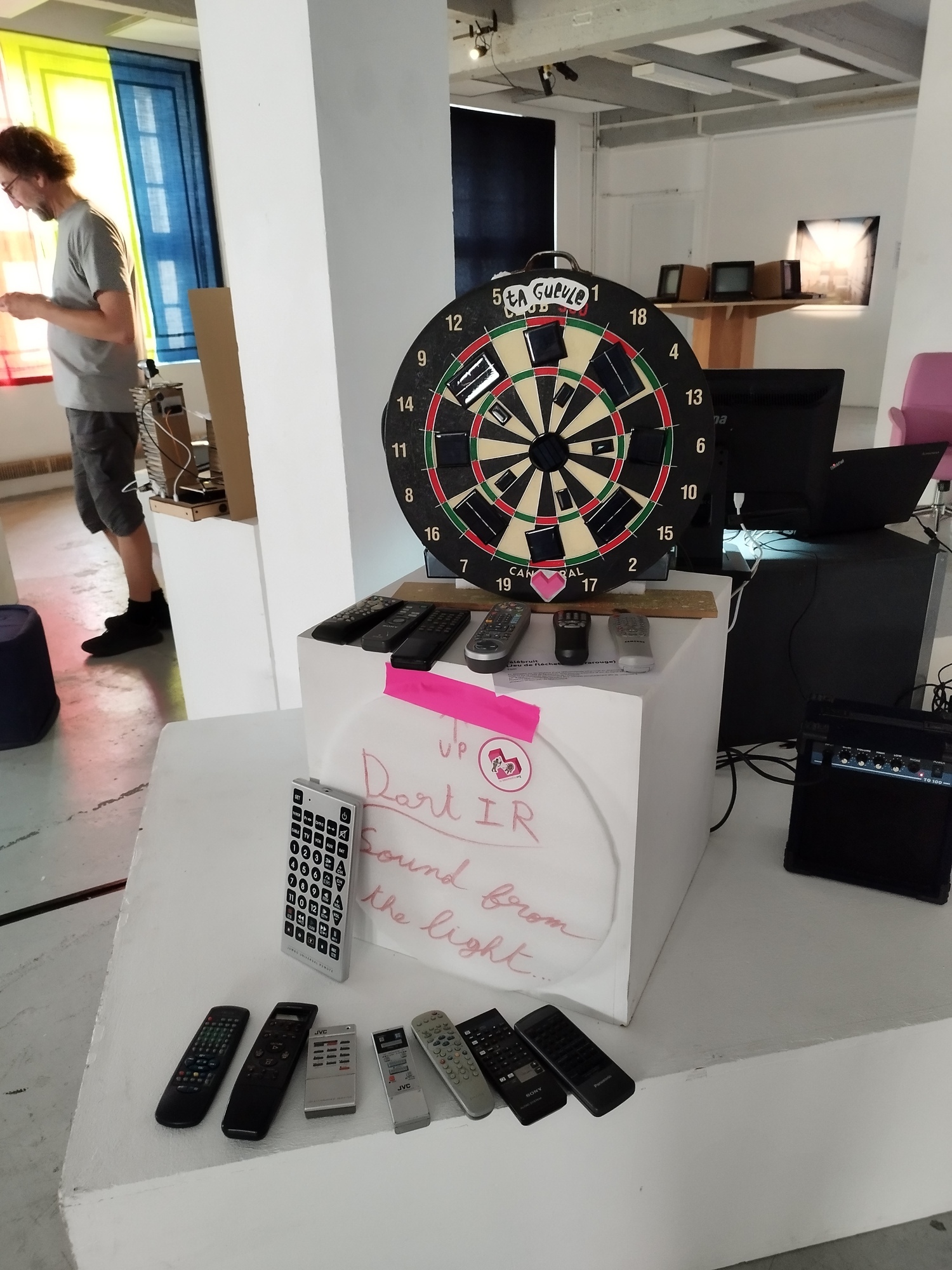 This is an artwork that I saw in Orléans, France. Many remote controls were placed around a space, and when you pointed and pressed them toward a dartboard, each button triggered a different sound. Each remote and each section of the dartboard produced unique tones, creating an unpredictable and playful sonic experience. I was fascinated by how something as ordinary as a TV remote could be transformed into a musical instrument and interactive performance tool.