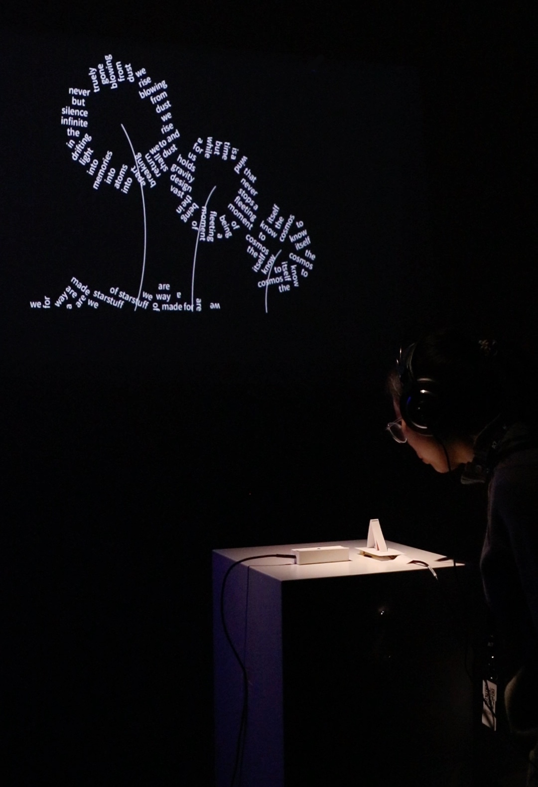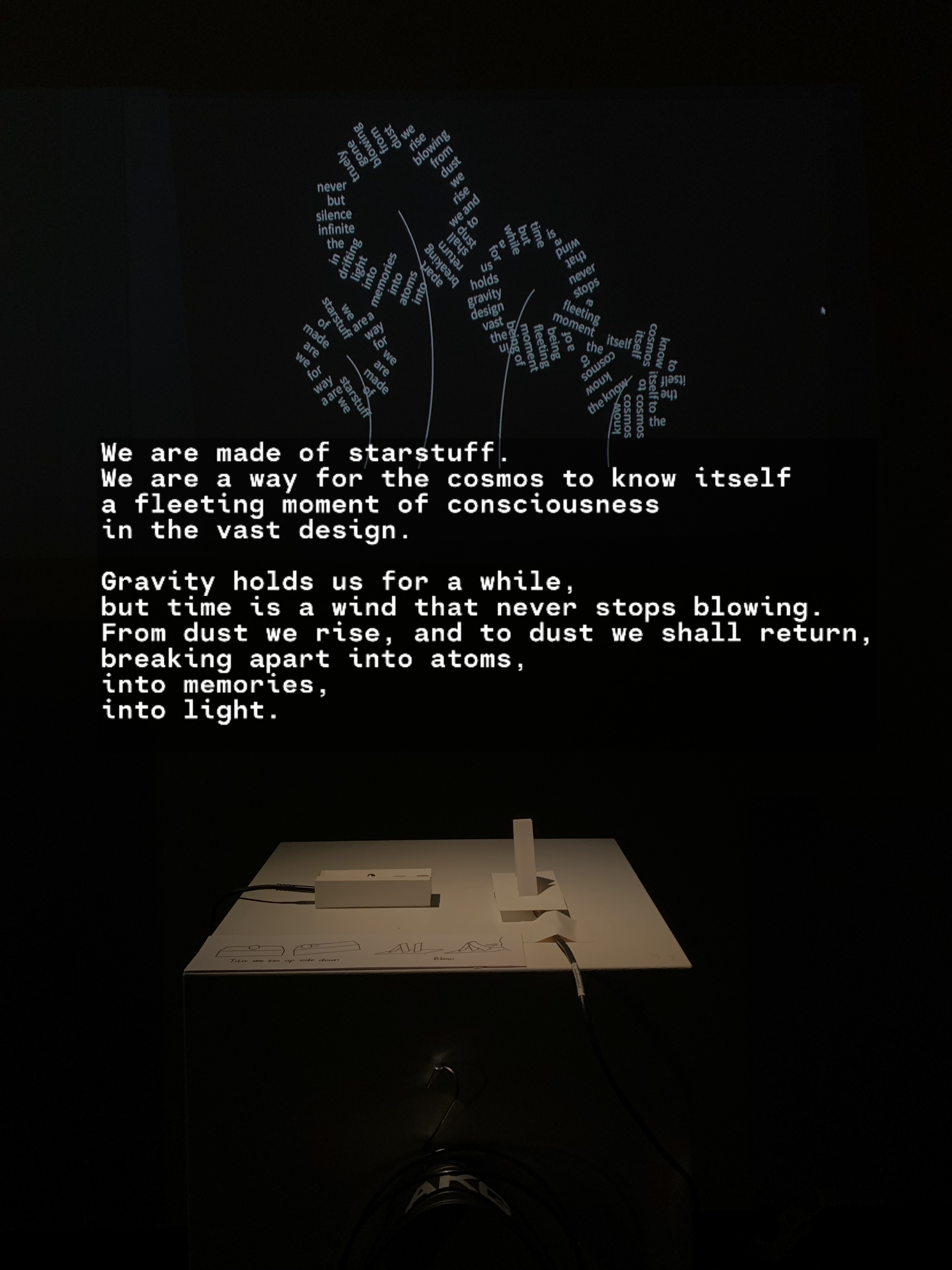 Audience interaction activates the work. A breath causes the words to detach and drift away, transforming language from a stable narrative into a physical substance that can fall, scatter, and disappear. As the letters reach the ground, they produce sound—echoes of breaking, of memory fragmenting, of atoms returning to light.