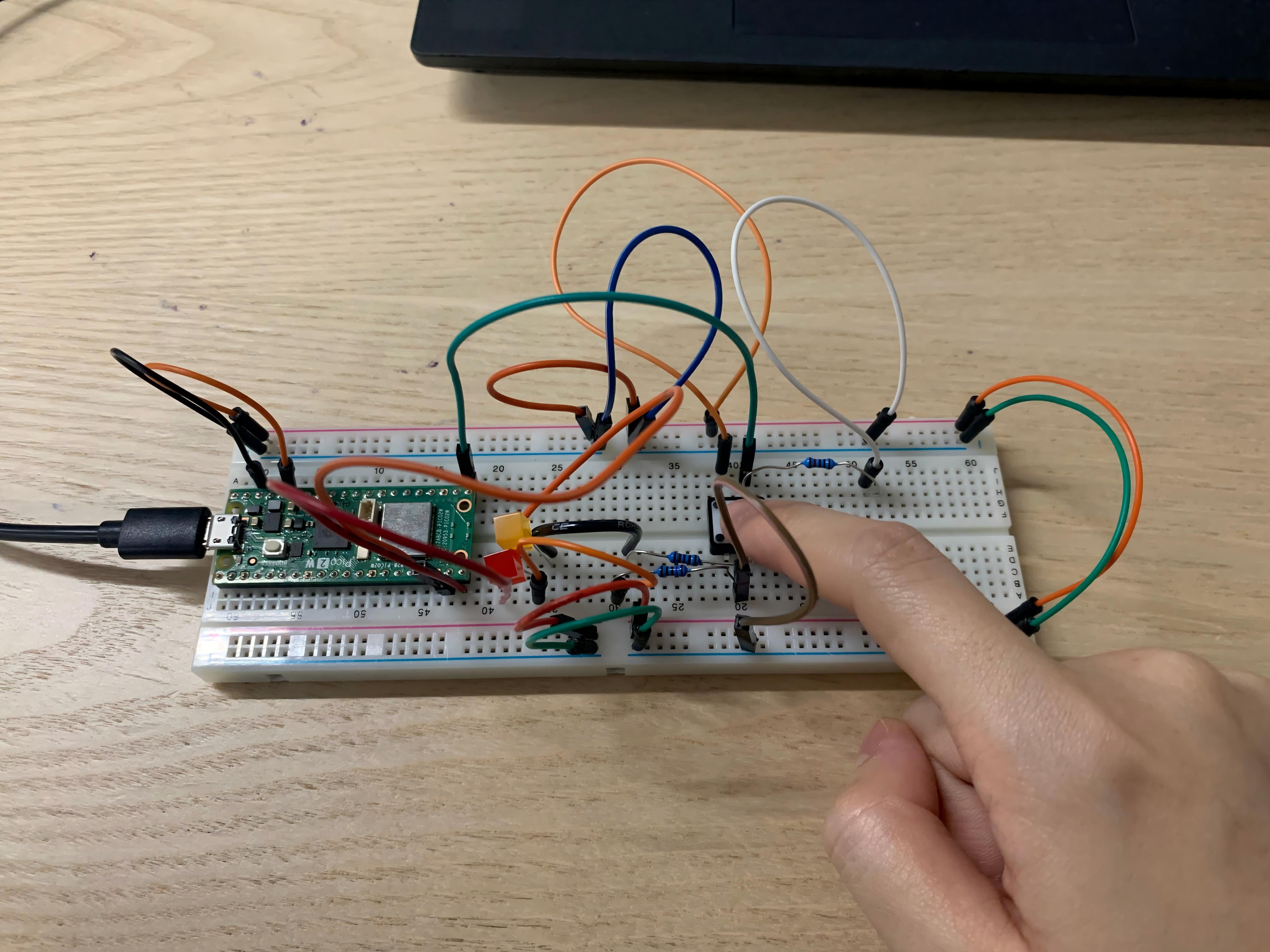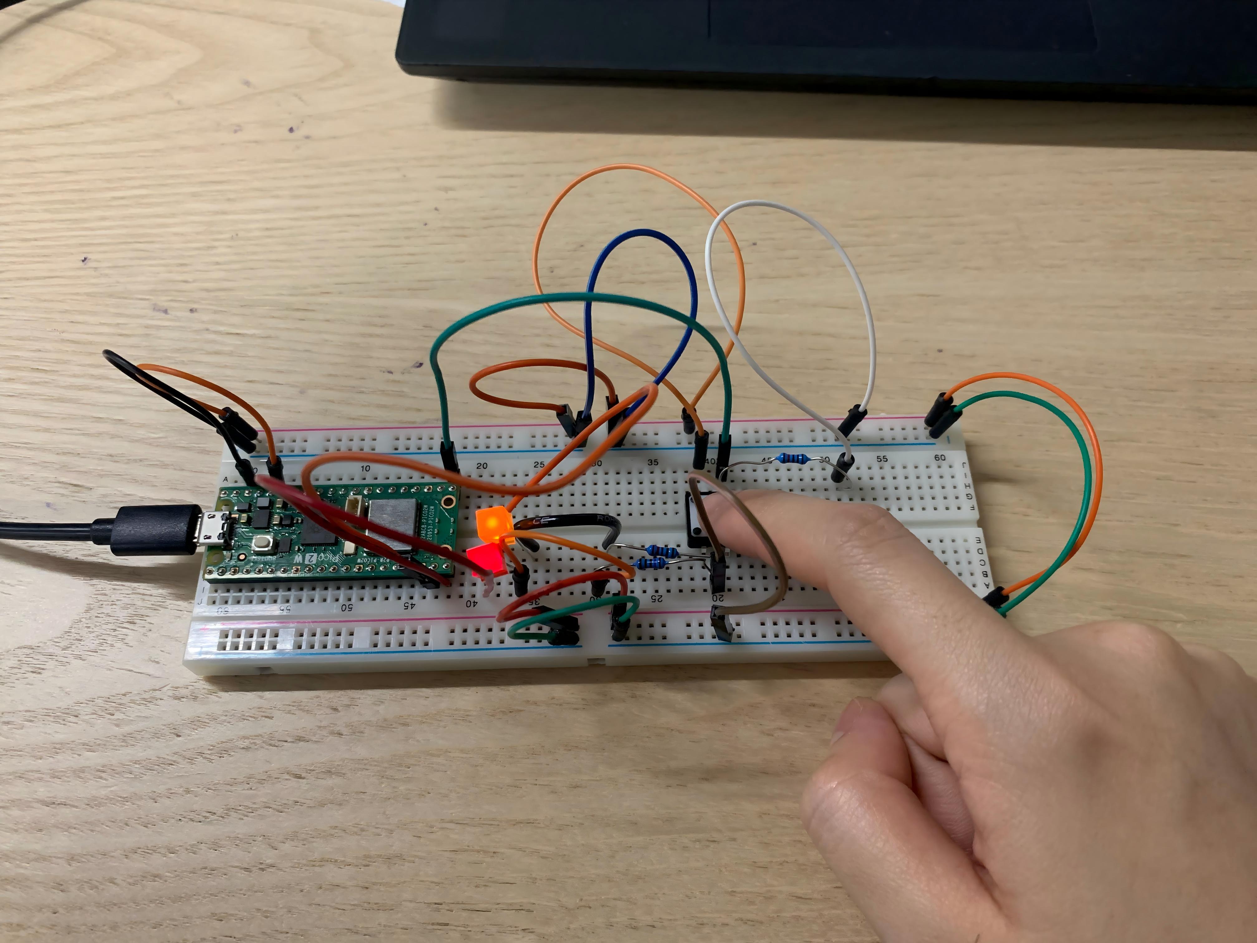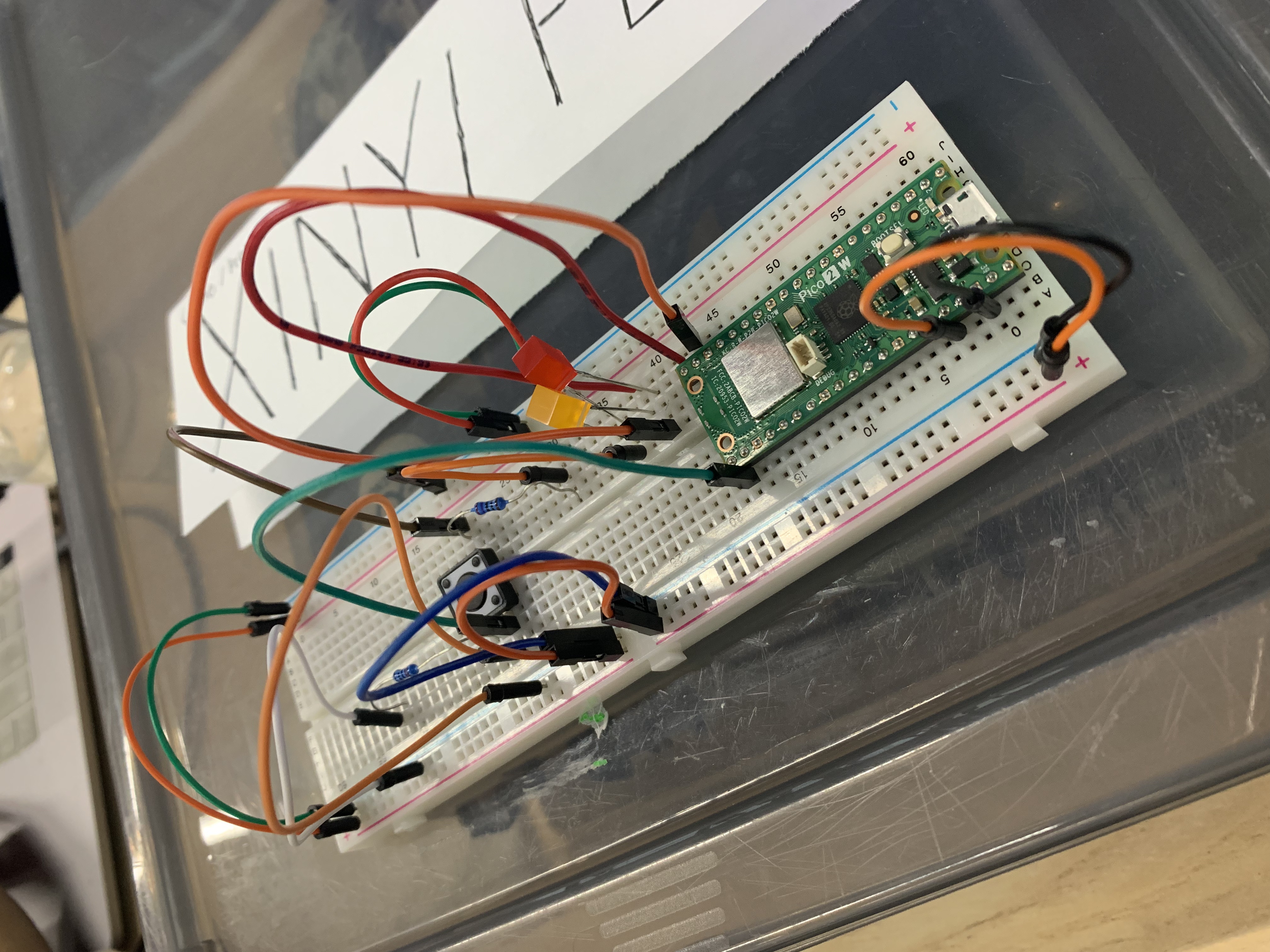 At first, I face some problem with coding because I am a new learning of coding(only java), so it’s hard for me to migrate knowledge from Java class to hardware computing. My problem is that, I thought the actions, 2 times of pressing bottom, transform the same HIGH signal to the Pico board, how can it be detected by the board into different information and trigger two LED? But through the hint of my classmate, counting, I realize the logic is the same, just use math.